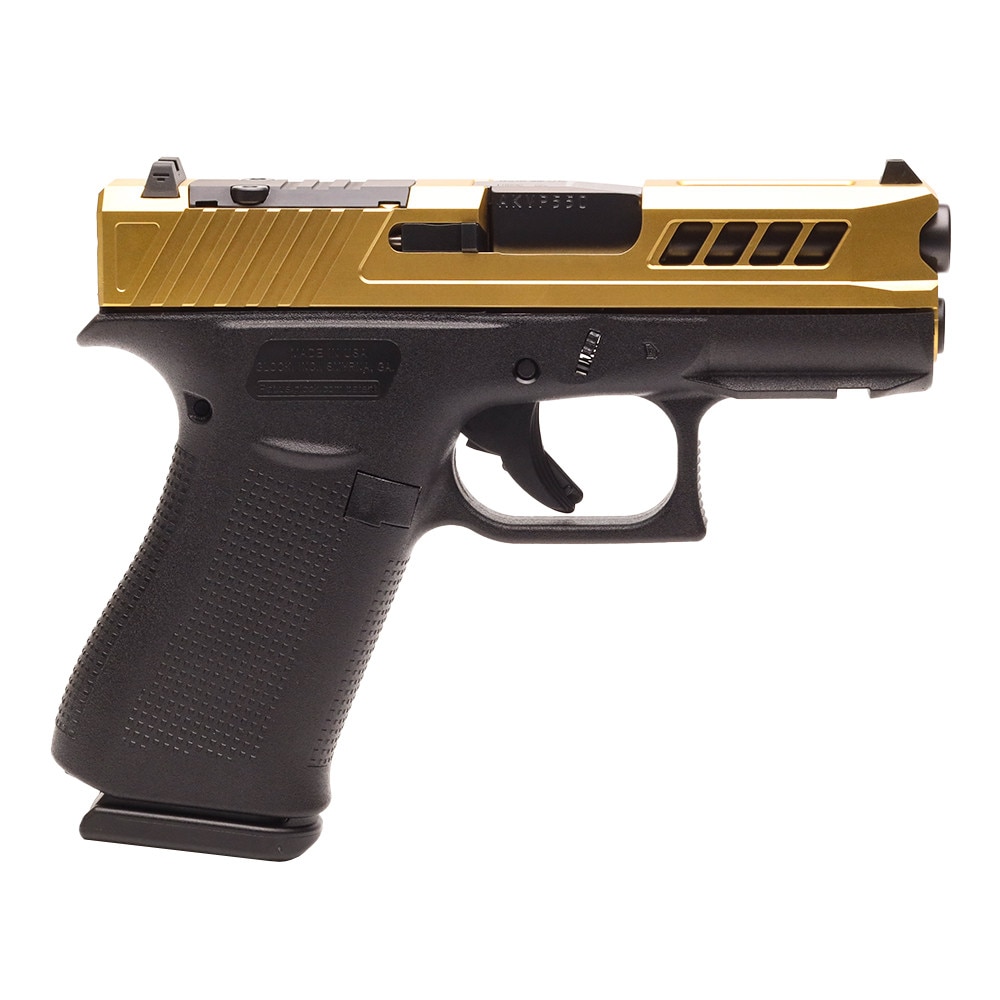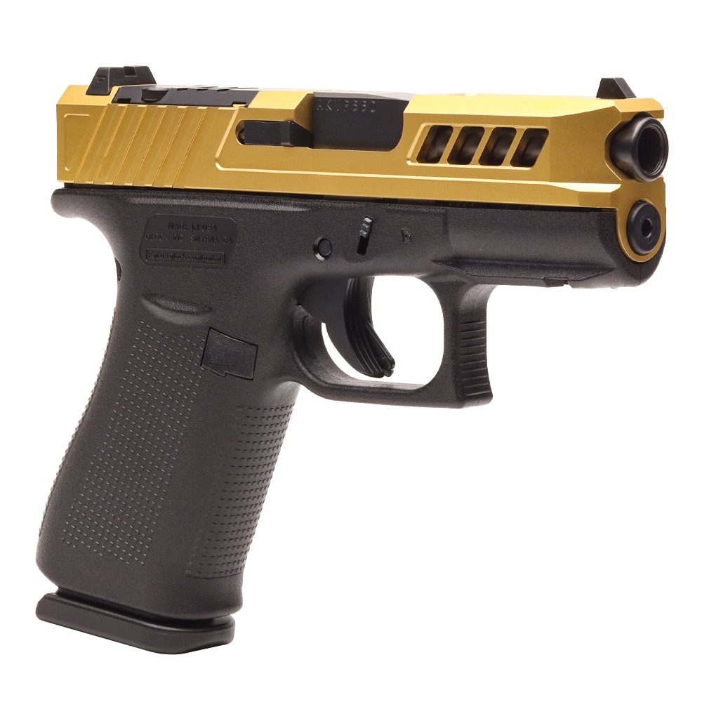 Experience the renowned performance and legendary safety of the GS Custom Glock 43X with True Precision Axiom Slide – Gold. As part of the world-famous GLOCK family, this 9mm model is engineered for reliability, accuracy, and durability.