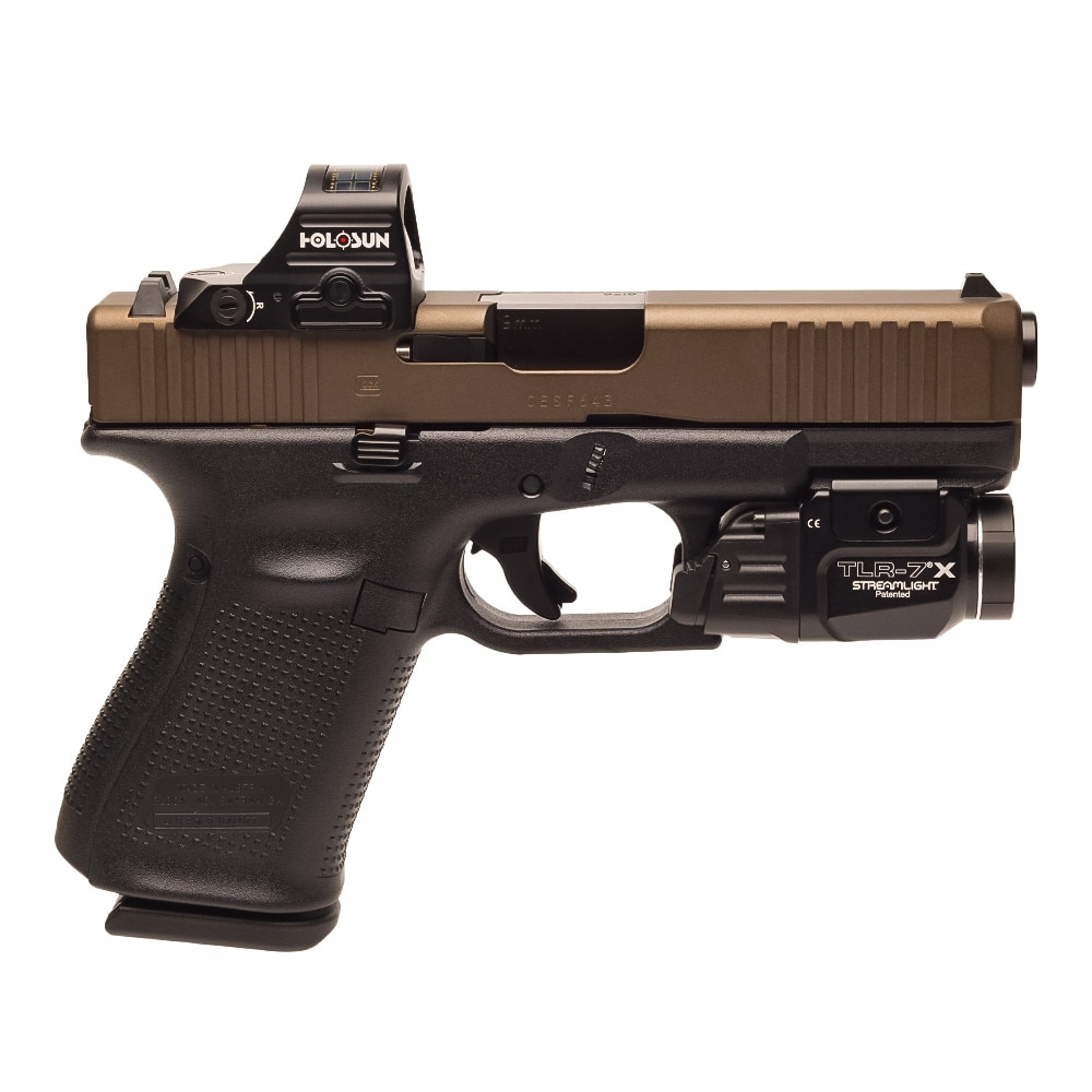 Experience the renowned performance and legendary safety of the GS Performance Custom G19 Gen5 Midnight Bronze 9mm w/ Holosun 507C and Streamlight TLR-7X. As part of the world-famous GLOCK family, this 9mm model is engineered for reliability, accuracy, and durability.